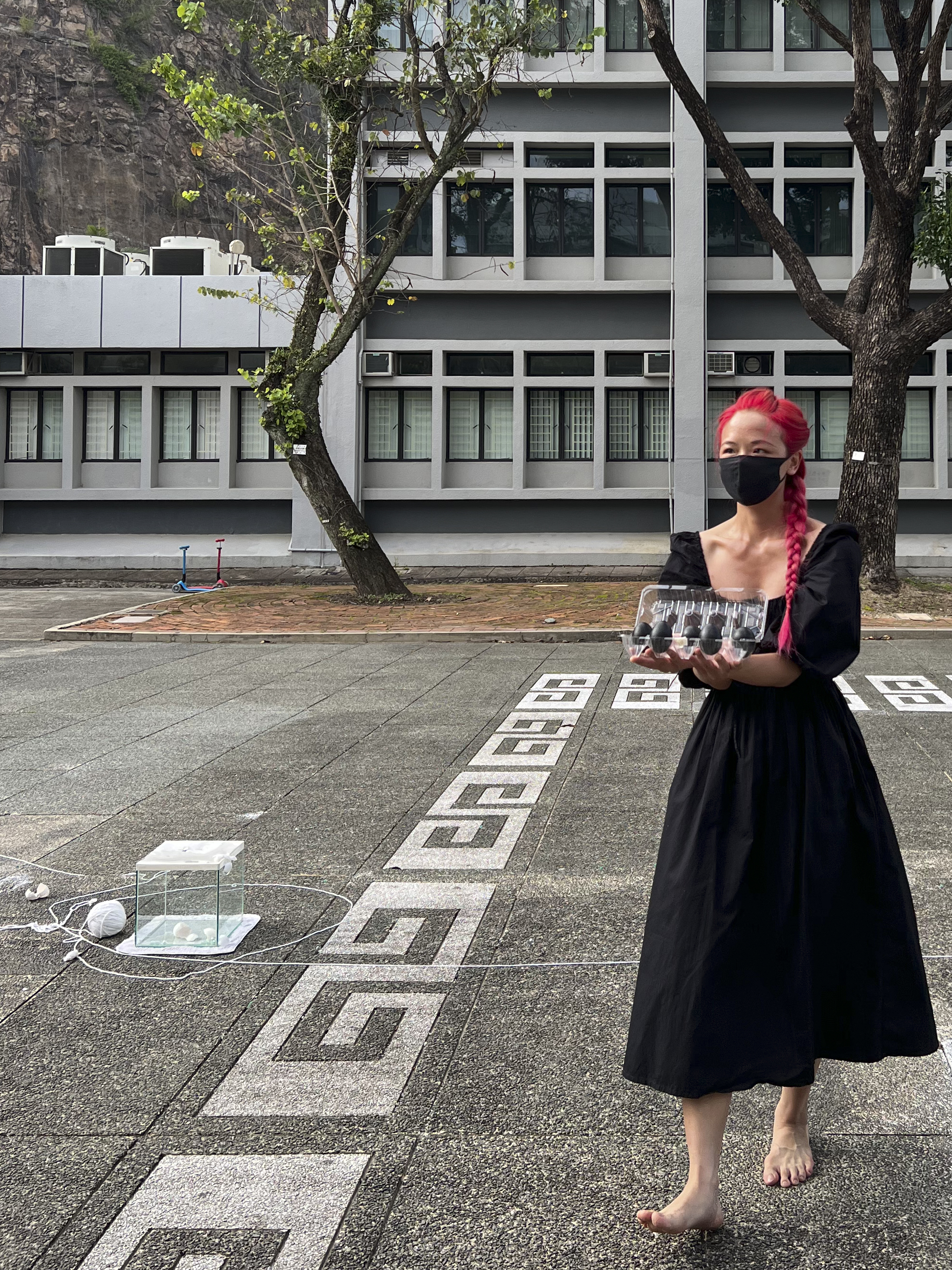 在中文大學的百萬大道上,脫下鞋襪,黑索帶緊箍雙手,赤腳前後慢行,踩著白線,圍繞玻璃缸一圈,再往後繞一個大圈,在口袋取出透明波子,投入與跌出,穿破了紙,跟隨白線往回走,取出十隻黑白蛋,再次投入與再次跌出,破裂後溢出的是水,步向觀眾隨機派發黑蛋,第四位觀眾抽中真黑蛋,墨水染黑了缸,把染上了墨的紙蓋在眼睛上,漆黑一片,摸著繩球收回白線,回到原點把線球靜置在鞋上。
