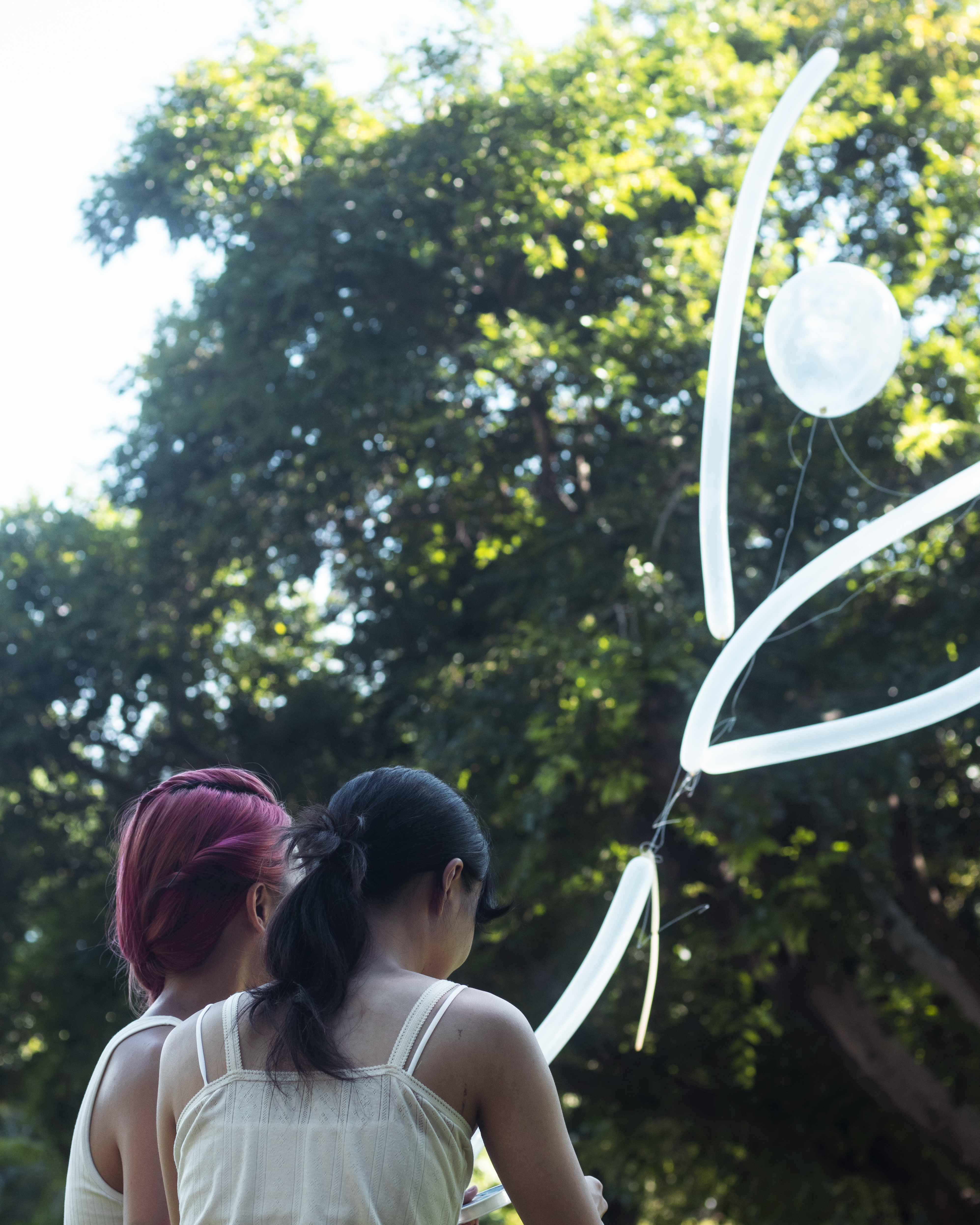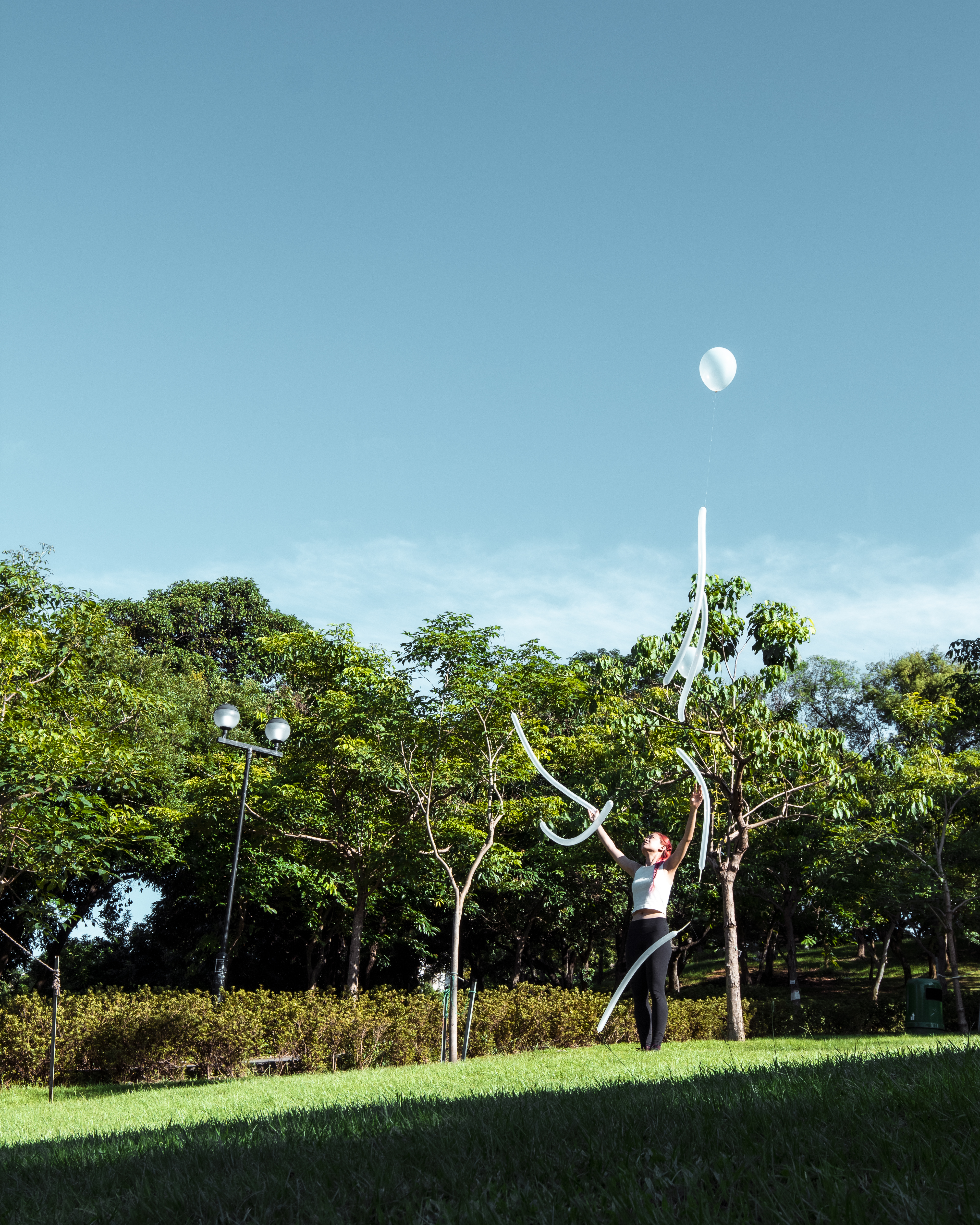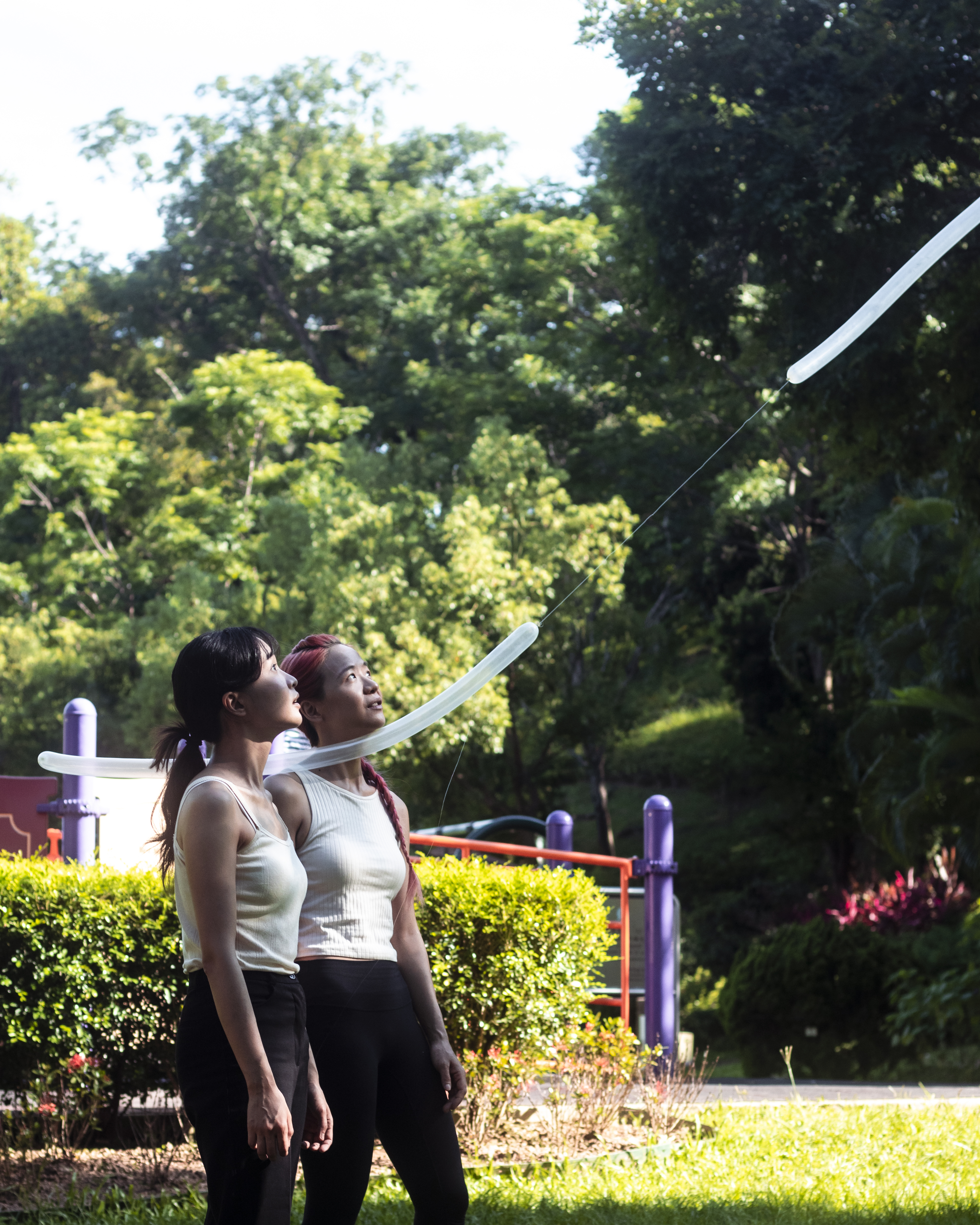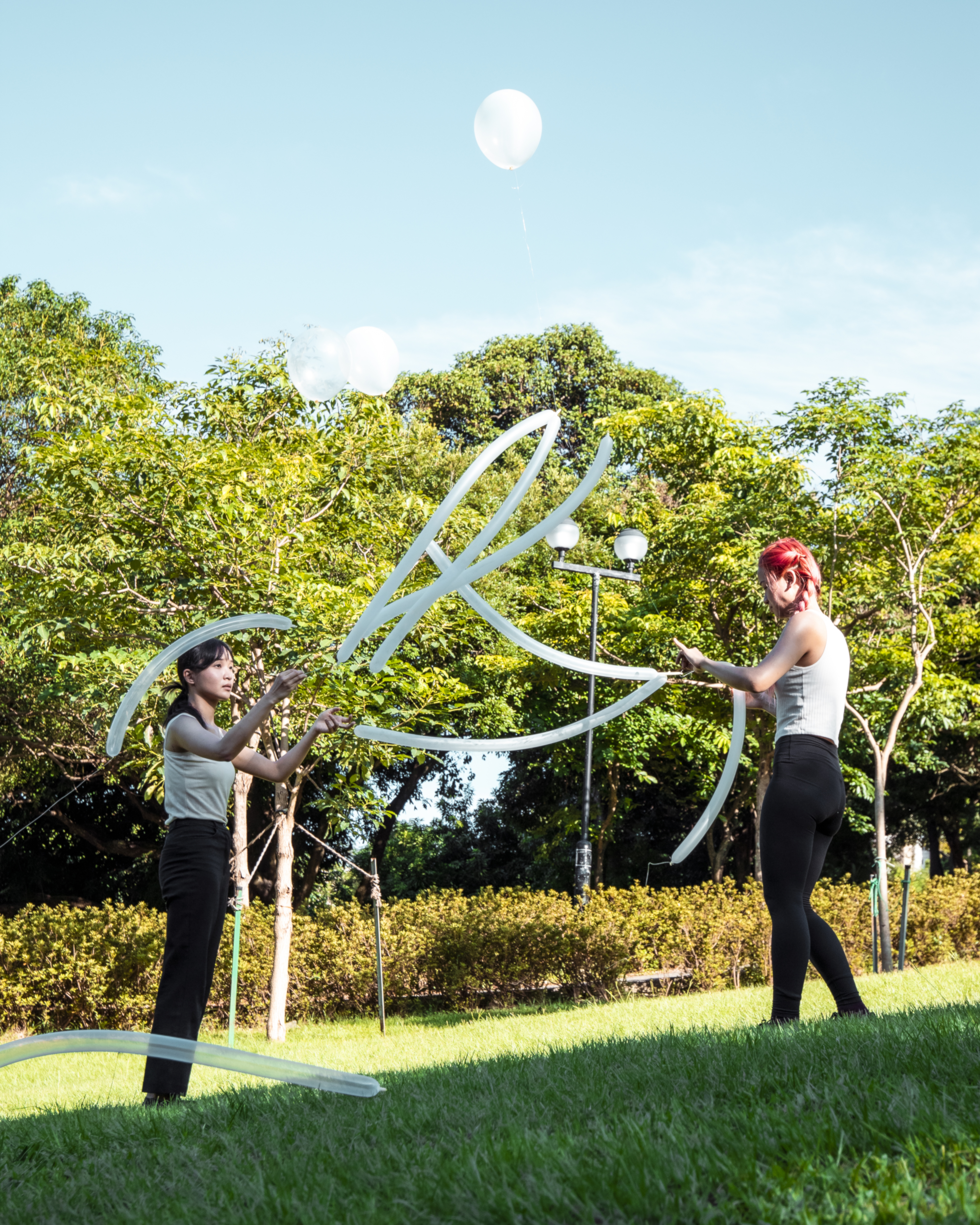 這次與Florence 的合作源自於她的BA畢業作品-[Ballon],她在大學時的創作媒介是雕塑,對她來說,這是一件重要的作品,由雕塑轉向Performance的契機。在與她聊天的過程中,她提及到過往的雕塑作品總是有重量、不變和固定的,因此,她想要創造一個暫時性且流動的雕塑,[Ballon]由此誕生,她也藉此開啟了Performance 的大門。在這次Performance 裡,我們選擇了在元朗公園的草地上進行,戶外的環境添加了不可控的因素,包括風的方向、樹枝的糾纏、被透明氣球吸引的小孩子等。「你覺得她們很在做什麼呢?是不是好像用氣球在天空上畫畫呢?」一位在旁觀賞的父親對孩子說。他們好奇地跑向我們,在旁邊觀察,兩個女孩子快樂地執起掉落在草地上的氣球,愉快地奔去。Florence說到之前她是自己一個人做,但在與我一起合作時,她就可以把氣球交給我,互相配合,在共同建構氣球時,我們都在觀察當中,觀察彼此的行動、風的轉向、途中被吸引的觀眾等。「好像在水中游的鰻魚啊!天空變成了海洋。」Joanna說。充滿氦氣的氣球徐徐升起,反抗地心吸力飄浮著,這個下午,成為了連結周遭人們的Happening。