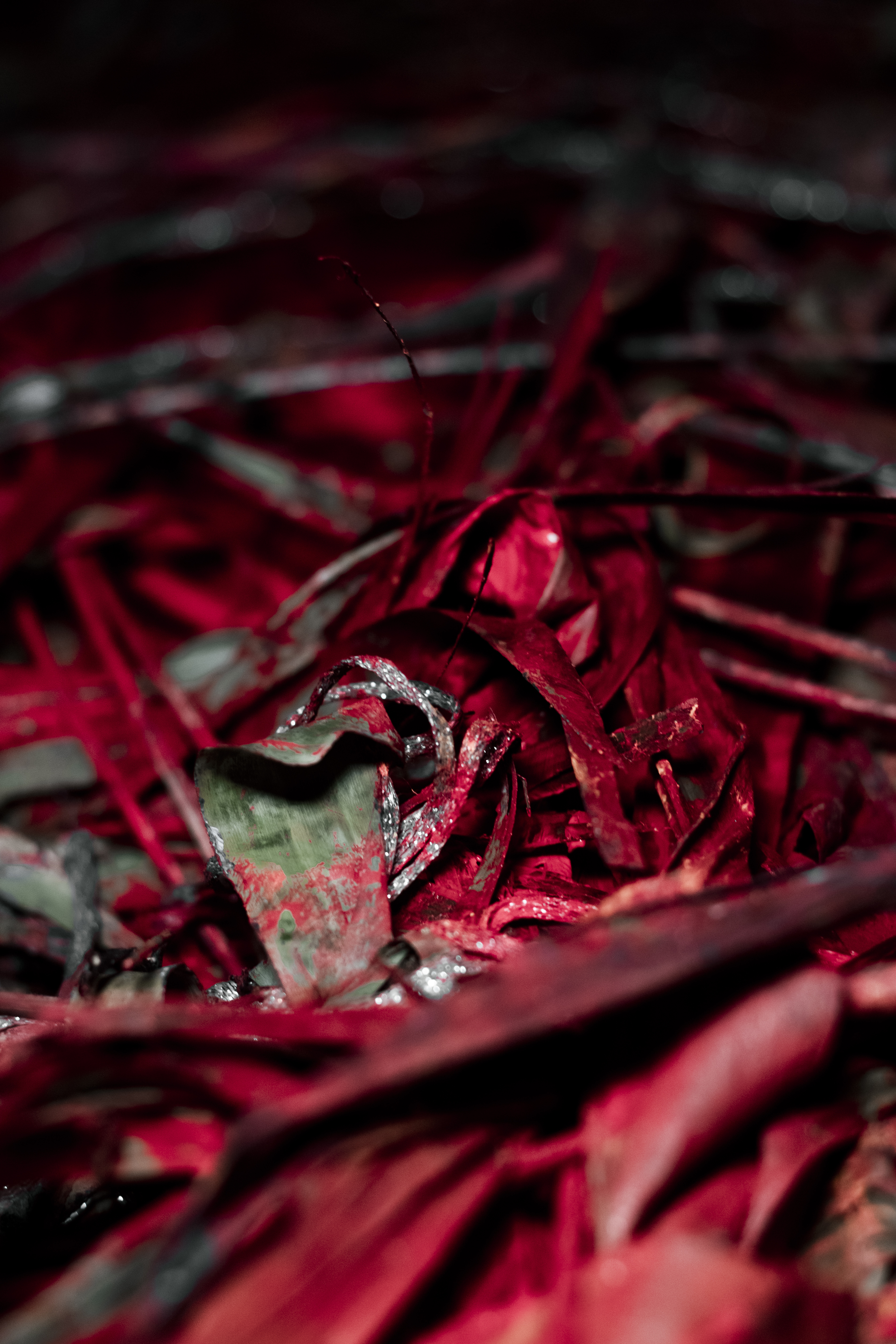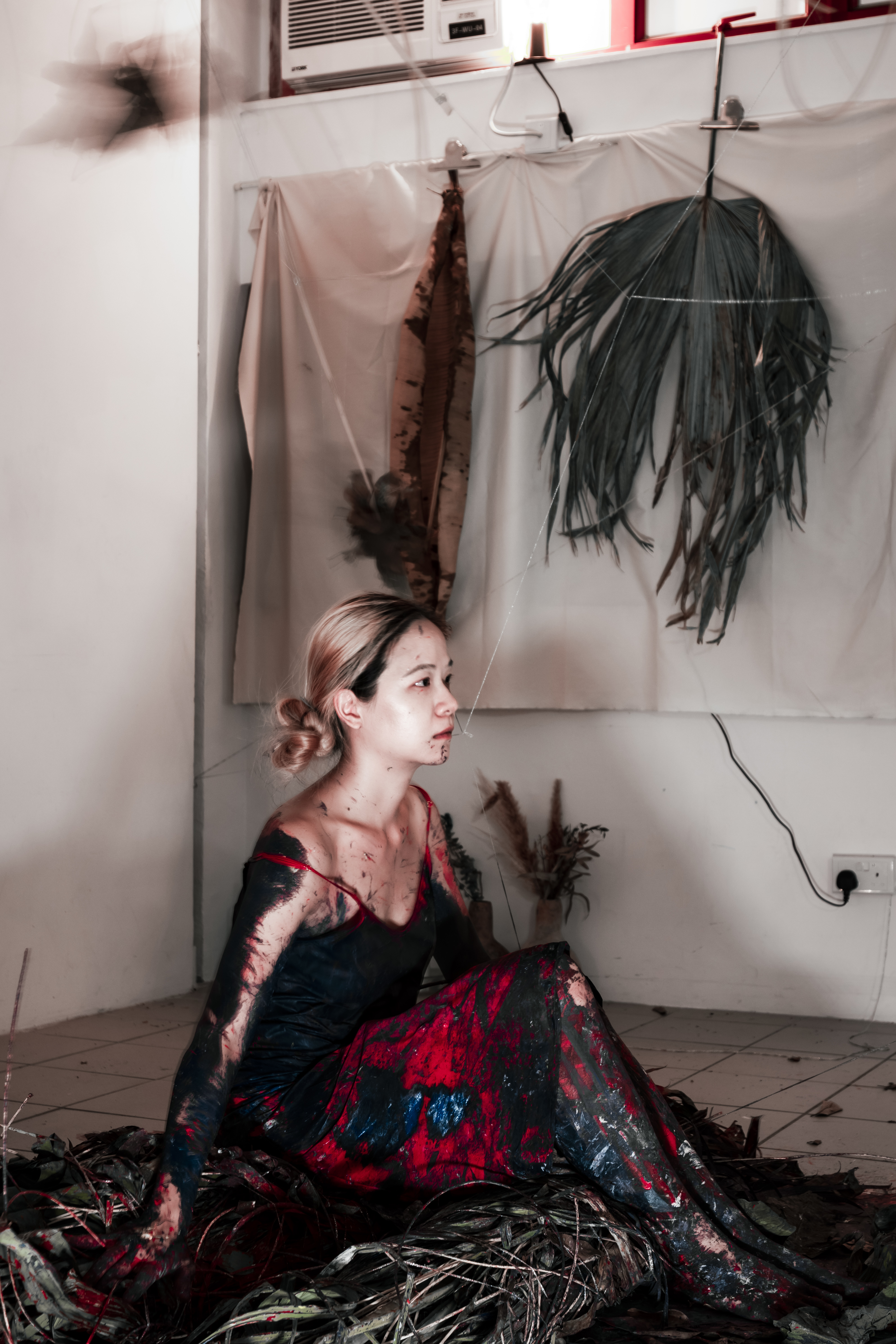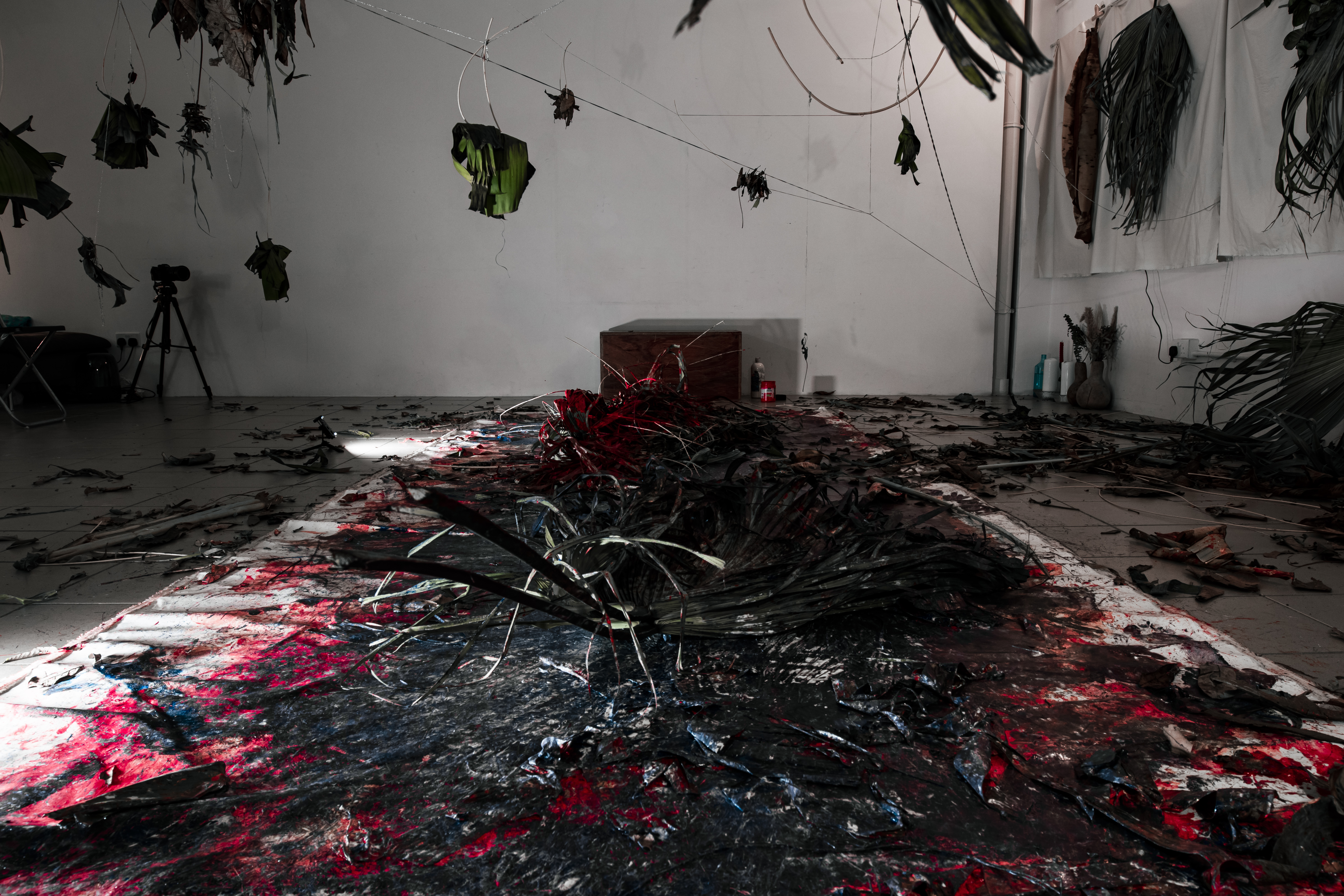第三天,痕跡、葉子裝置與銀線分割了的空間,避開、穿梭、跨過,身體被動地作出反應,猶如聲音的迴響,自主的部分到底有多少?紅色顏料如同熊熊大火燃亮在地上的畫布,混合著藍色顏料帶來難以預測的混沌,與混合物來回滾落,一步一腳印,在凌亂無序的色彩中尋找如曇花一現的片刻寧靜。